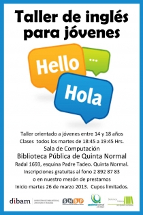 "Taller de Inglés para Jóvenes"Taller orientado a jóvenes entre 14 y 18 añosClases todos los martes de 18:45 a 19:45 Hrs.Sala de Computación.Biblioteca Pública de Quinta Normal.Radal 1693, esquina Padre Tadeo. Quinta Normal.Inscripciones gratuitas al fono 2 892 87 83 o en nuestro mesón de préstamos...