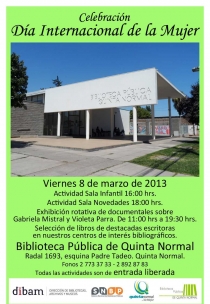 Celebración Día Internacional de la MujerViernes 8 de marzo de 2013.Actividad Sala Infantil 16:00 hrs.Actividad Sala Novedades 18:00 hrs.Exhibición rotativa de documentales sobre Gabriela Mistral y Violeta Parra. De 11:00 hrs a 19:30 hrs.Selección de libros de destacadas escritoras en nuestros...
