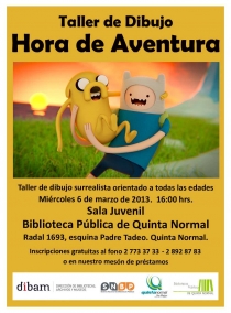 ¡¡A pedido del público vuelve: Taller Hora de Aventura!!Taller de dibujo surrealista orientado a todas las edades.Inscripciones gratuitas al fono 2 773 37 33 2 892 87 83o en nuestro mesón de préstamos.Miércoles 6 de marzo de 2013. 16:00 hrs.Sala Juvenil de Biblioteca Pública de Quinta Normal.