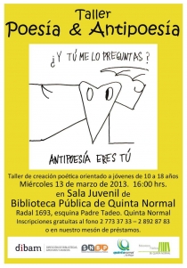 El miércoles 13 de marzo a las 16:00 hrs. realizaremos en Sala Juvenil de Biblioteca Pública de Quinta Normal un entretenido taller titulado Poesía & Antipoesía, se trata de una actividad de creación poética orientada a jóvenes de 10 a 18 años. Inscripciones gratuitas al fono 2 773 37 33 - 2...