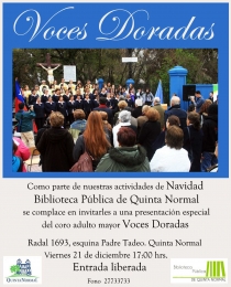Como parte de nuestras actividades de Navidad, Biblioteca Pública de Quinta Normal se complace en invitarles a una presentación especial del coro adulto mayor Voces Doradas, a realizarse en Sala Novedades el día viernes 21 de diciembre a las 17:00 hrs. Entrada liberada.