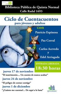 La Biblioteca Pública de Quinta Normal presentará durante noviembre y diciembre un Ciclo de Cuentacuentos gratuito para jóvenes y adultos, el cual inicia este jueves 17 de noviembre, a las 18:30 horas, con la presentación del cuentacuentos Patricio Espinosa con el espectáculo El matrimonio