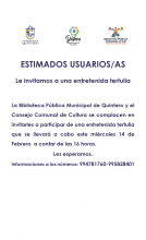 La Biblioteca Pública Municipal de Quintero y el Consejo Comunal de Cultura se complacen en invitarles a participar de una entretenida tertulia que se llevará a cabo este miércoles 14 de febrero a contar de las 16 horas.