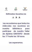 Los esperamos hoy a contar de las 17 horas en una nueva jornada de nuestro taller de ajedrez. Recordar que es GRATUITO y abierto quien desee aprender.
