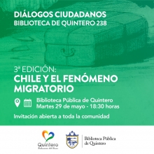 Los invitamos cordialmente para una nueva edición de Diálogos Cuidadanos, Chile y el fenómeno migratorio, los esperamos a todos este martes 29 de mayo a las 18:30 horas, en nuestras dependencias ubicadas en Arturo Prat N° 1960, Quintero.