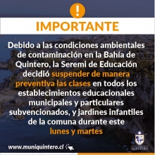 Informamos a la comunidad educativa que debido a las condiciones ambientales la Seremi de Educación suspendió las clases durante el resto de la jornada de hoy y mañana.
