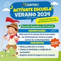 Compartimos para ustedes.Fuente: Fanpage de Facebook Ilustre Municipalidad de Quintero.Entre este miércoles 3 y viernes 5 de enero serán las inscripciones para el Programa Actívate Escuela Verano 2024, que cuenta con 100 cupos para niños y niñas de la comuna. Los esperamos entre las 10:00 y...