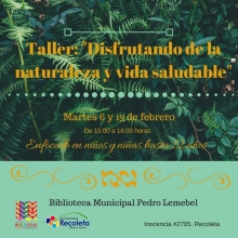 Te invitamos a nuestra Guaguateca durante los martes 6 y 13 de febrero a las 15:00 hrs. Para que acompañes a tus niños y niñas al Taller "Disfrutando de la Naturaleza y Vida Saludable" para niños y niñas hasta 12 años en nuestra Biblioteca Pedro Lemebel..
