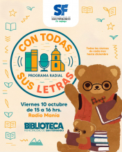 Desde este viernes 10 de octubre, a las 15 horas, la Biblioteca Municipal de San Fernando estrena en Radio Manía FM su primer programa cultural “Con Todas Sus Letras”, conducido por la periodista e historiadora Francisca Riveros.