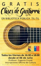 Como parte de las actividades gratuitas del INJUV en Til Til este año 2012 se realizarán nuevamente, al igual que el año anterior, clases gratuitas de guitarra enfocada a niños y jóvenes de nuestra comuna en las dependencias de la Biblioteca Pública de Til Til. Las inscripciones estan abiertas en la misma biblioteca ubicada en Ignacio Carrera Pinto 02 esquina Arturo Prat. Las sesiones estarán acargo del profesor y músico tiltilano Eugenio Cruzatt. La cita será cada viernes de 16:30 a 18:00 hrs. apartir del viernes 6 de Julio.