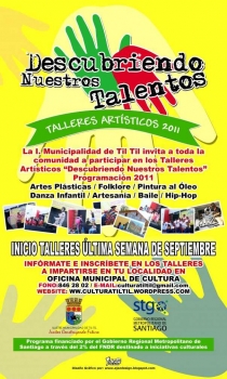 Apartir de la última semana de Septiembre comenzarán los talleres artísticos del Programa Cultural de la I. Municipalidad de Til Til "Descubriendo Nuestros Talentos", el que en su cuarta versión ofrece talleres gratuitos de Artes Plásticas, Folklore, Pintura al Óleo, Dan¿za Infantil, Artesanía,...