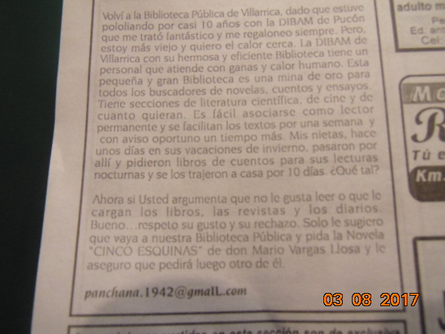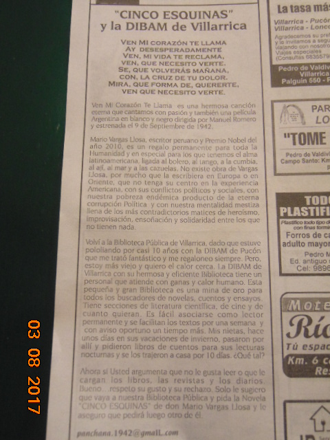 Allí se habla sobre el escritor Mario Vargas Llosa y se invita a leer el libro “Cinco Esquinas” de dicho autor, pero lo que más nos sorprendió es sobre la apreciación que tiene este SEÑOR en relación a nuestra BIBLIOTECA PÚBLICA DE VILLARRICA, una parte de su columna dice textualmente : LA DIBAM DE VILLARRICA CON SU HERMOSA Y EFICIENTE BIBLIOTECA, TIENE UN PERSONAL QUE ATIENDE CON GANAS Y CALOR HUMANO, ESTA PEQUEÑA BIBLIOTECA ES UNA MINA DE ORO……… No nos queda más que agradecer estas hermosas palabras e invitar a nuestra comunidad de Villarrica a visitarnos para disfrutar de nuestros libros y consultar sobre los talleres y actividades que se realizan cada año.